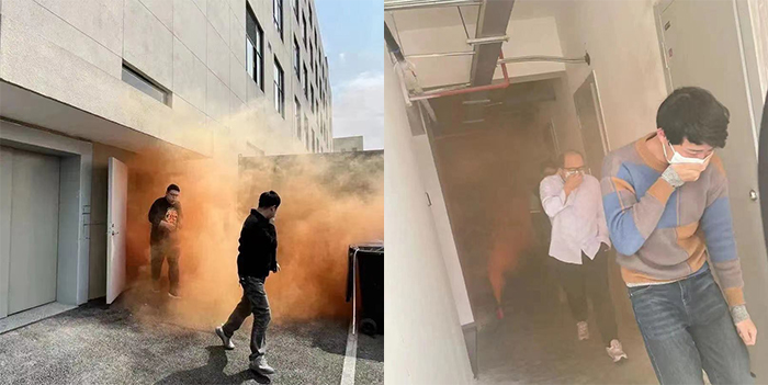 13:30,随着急促的警报声响起,烟雾弥漫开来,消防演练正式开始。各部门立刻组织员工有序撤离,大家用湿毛巾捂住口鼻,压低身体,迅速撤离办公区域和生产大楼,集合至空旷区域。