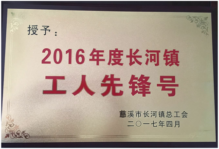 为充分发挥全镇职工在建设“人文小镇 品质长河”中的主力军作用,进一步深化“工人先锋号”创建活动,激励广大职工爱岗敬业、创新创造、学赶先进、争创一流,根据《慈溪市工人先锋号创建和评选管理办法》, 在开展2016年度长河镇“工人先锋号”评选活动中,公司荣获2016年度长河镇“工人先锋号”,张静同志被授予2016年度“首席工人”。